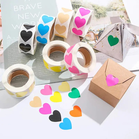 بكرة واحدة من ملصقات على شكل قلوب ملونة قابلة للإزالة ومقاومة للماء مناسبة كهدية حلوى مختومة وتصلح كديكور هدية في الأعياد